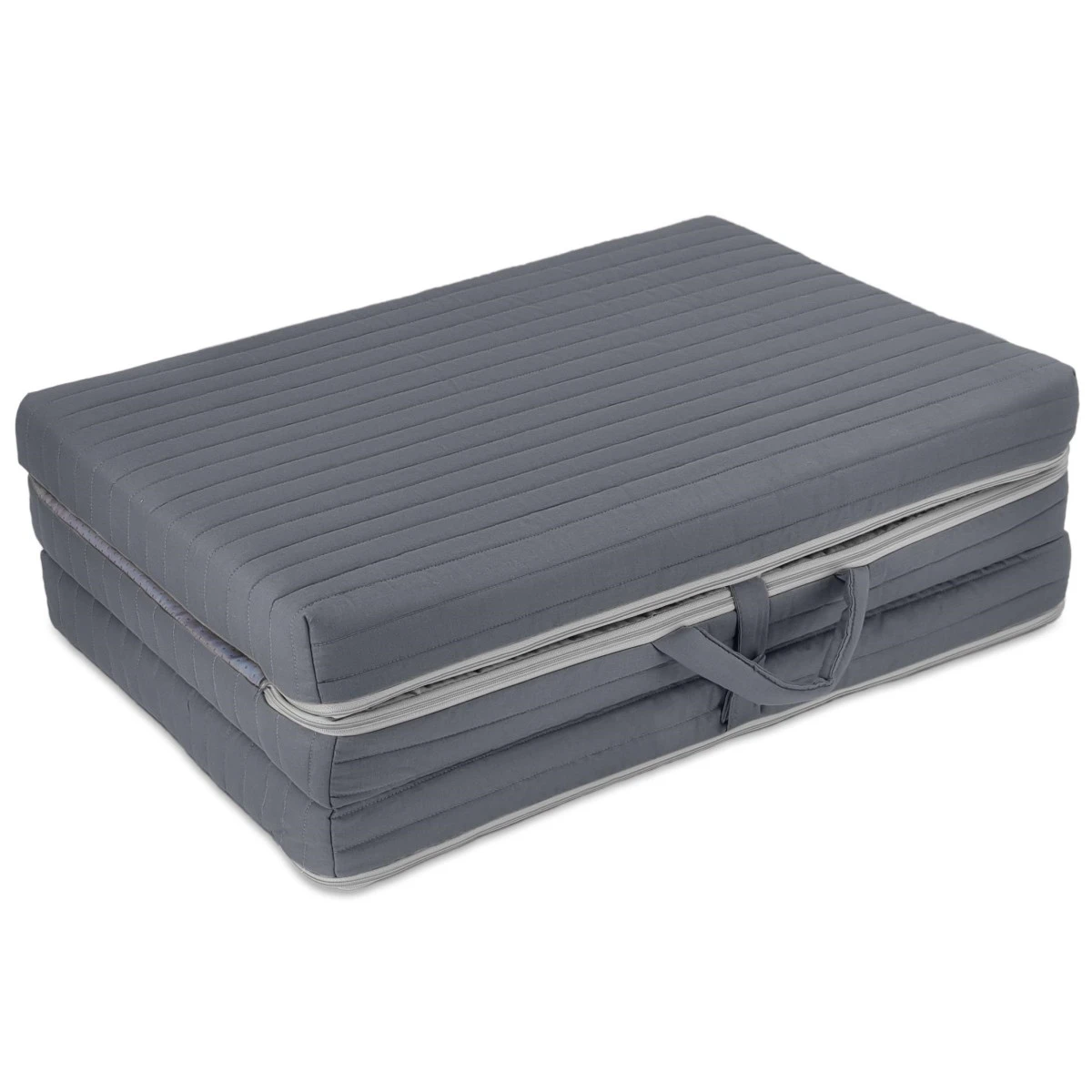 Het matrasje heeft een standaard maat van 120 x 60 cm en past hiermee in de meeste reis- en campingbedjes. Je neemt het matras net als een campingbed eenvoudig mee, hij is namelijk in drie delen opvouwbaar en te dragen met het handvat. Hij wordt tevens geleverd inclusief draagtas met schouderband om hem goed op te bergen en mee te nemen.