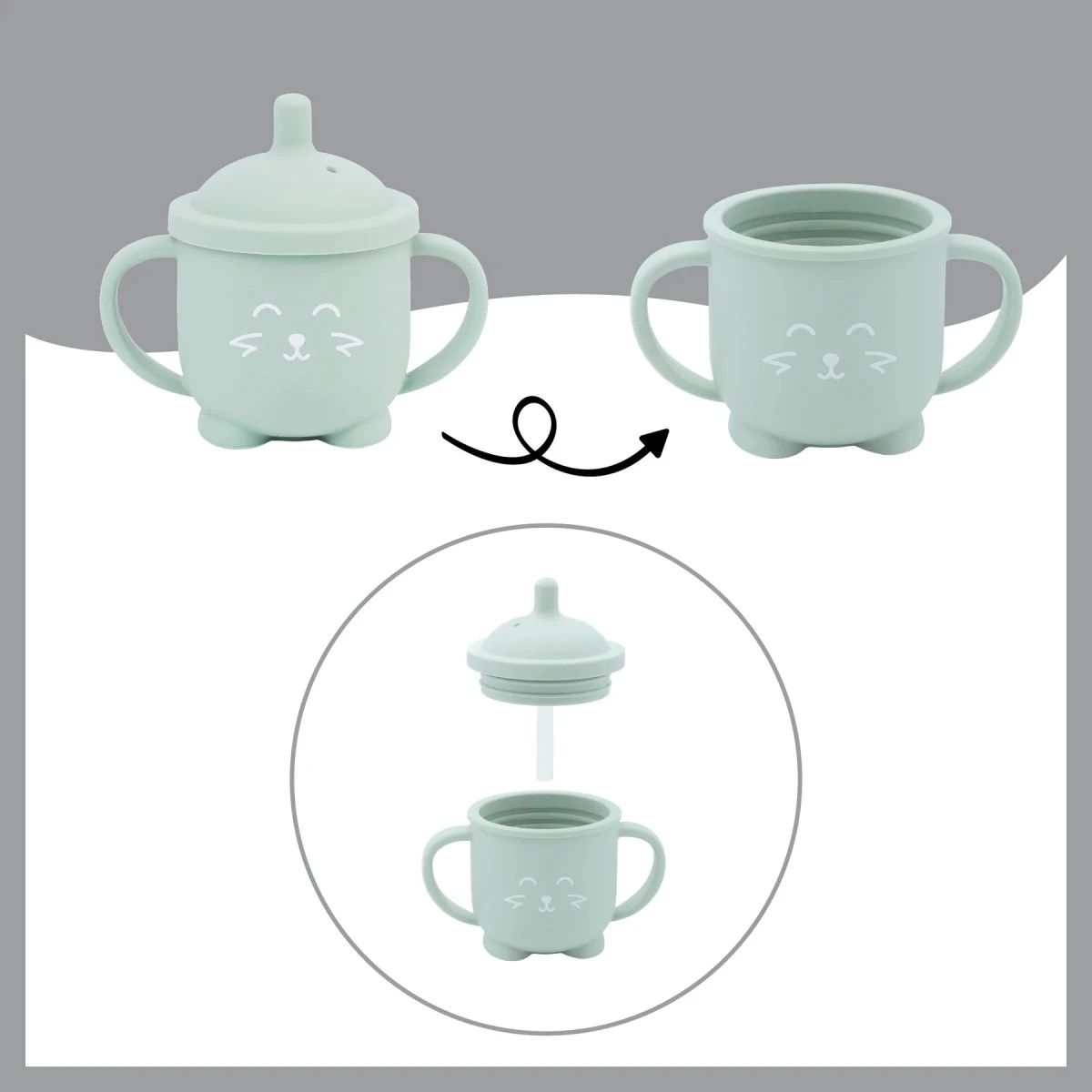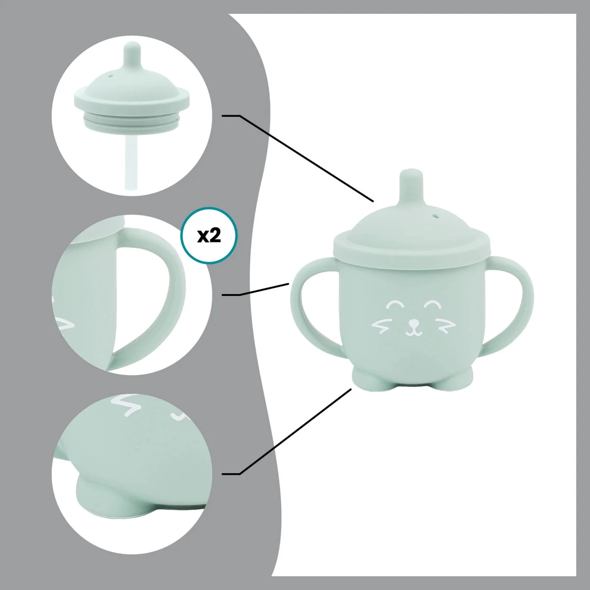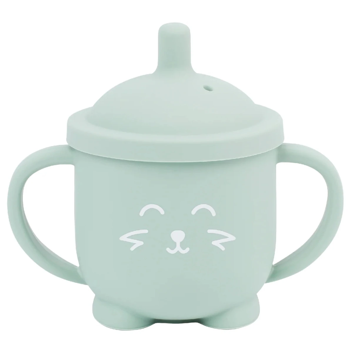 Met de drinkbeker leert jouw kindje zelfstandig te drinken, net zoals grote mensen. Dankzij de grote oren aan de drinkbeker is deze gemakkelijk vast te houden, de beker blijft na het terug neerzetten stevig staan doordat hij 2 schattige pootjes heeft. Hij is gemaakt van 100% silicone, waardoor hij zacht, licht en toch sterk is! De beker heeft een inhoud van 150ml en is geschikt voor kindjes vanaf 6 maanden. Hij is tevens vaatwasserbestendig.