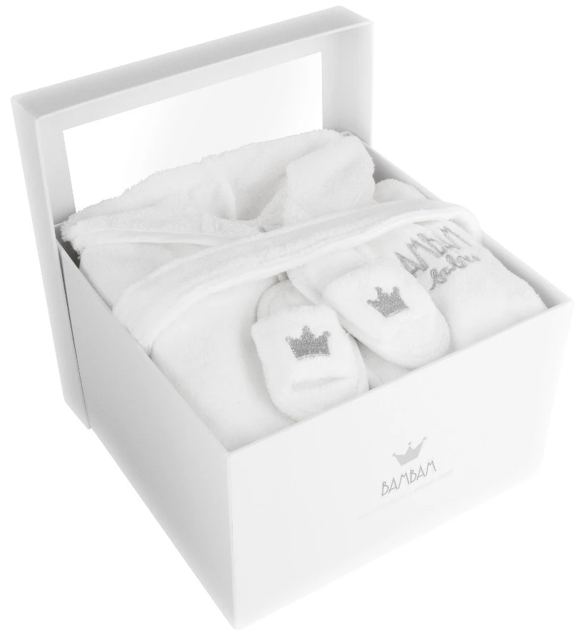 Deze bad geschenkset van BamBam is een leuk setje om cadeau te geven aan (toekomstige) ouders. De set bevat een badjasje in maat 50/56 en bijpassende badslippers. Het badjasje en de slippers zijn gemaakt van zacht badstof en is dus heel comfortabel voor een pasgeboren kindje.
