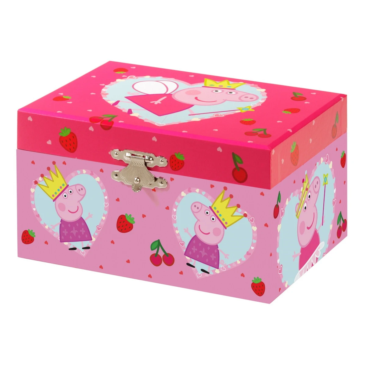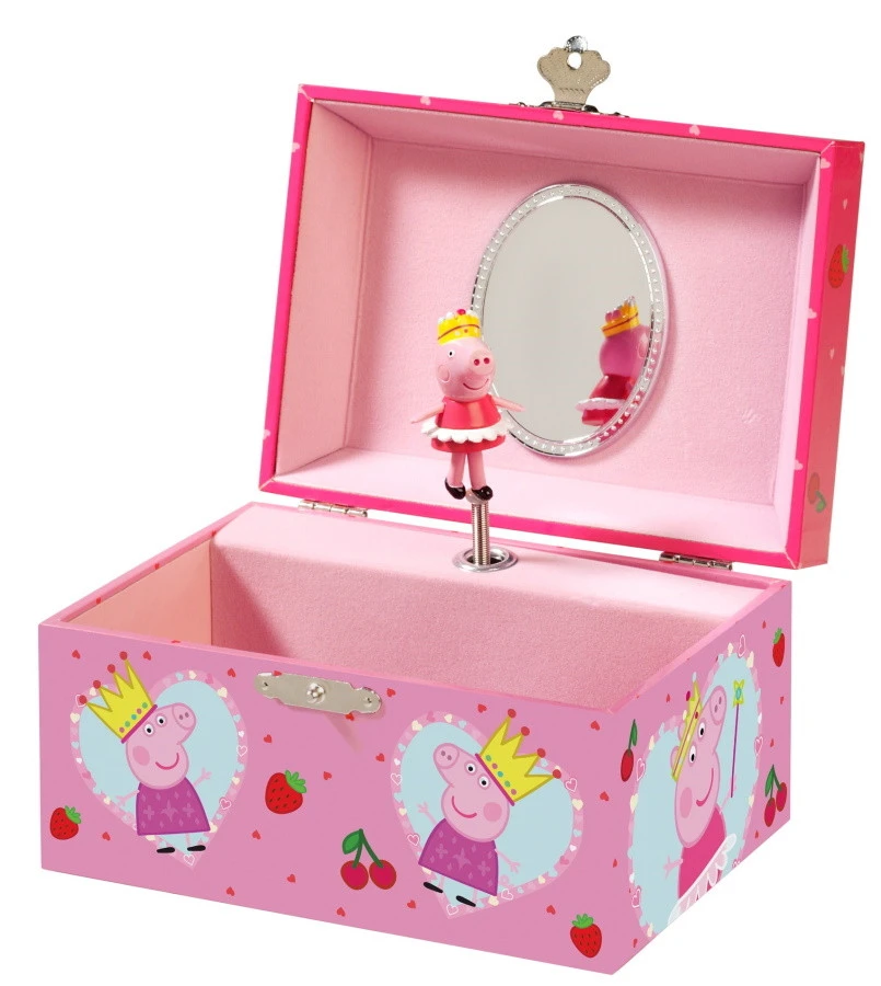 Wanneer je het kistje opent hoor je muziek en zie je Peppa Pig pirouettes draaien. Ook heeft de binnenkant van het kistje een spiegeltje en voldoende ruimte voor alle schatten van je kleintje. De afmetingen zijn: 15 x 12 x 9 cm