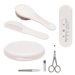 De Bébé-Jou geschenkset is een leuk setje om cadeau te geven aan (toekomstige) ouders. In deze set zit een kapsetje (borsteltje en kammetje), manicuresetje en een badthermometer. Drie basisproducten die iedereen nodig heeft voor een goede verzorging van een pasgeboren kindje!