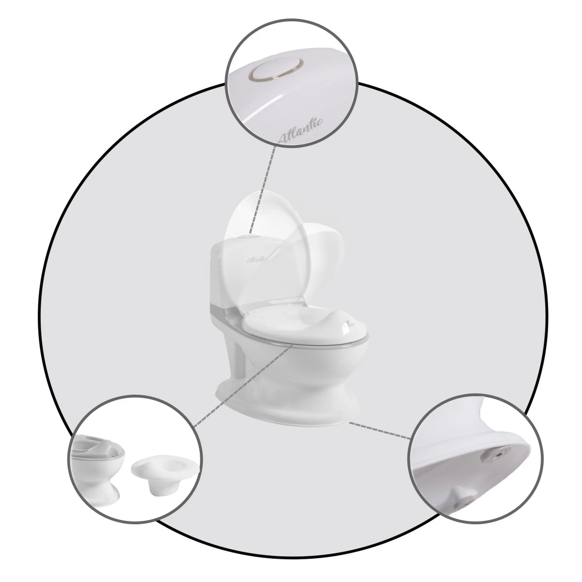 De Atlantic heeft een deksel die omhoog en omlaag kan zoals een normale wc-bril. Tevens dient het als soort rugleuning en geeft het je kindje ondersteuning. Het uitneembare potje maakt het voor jou als ouder gemakkelijk om hem te legen en schoon te maken. De doorspoelknop met geluidseffecten van stromend water maakt het potje echt compleet!