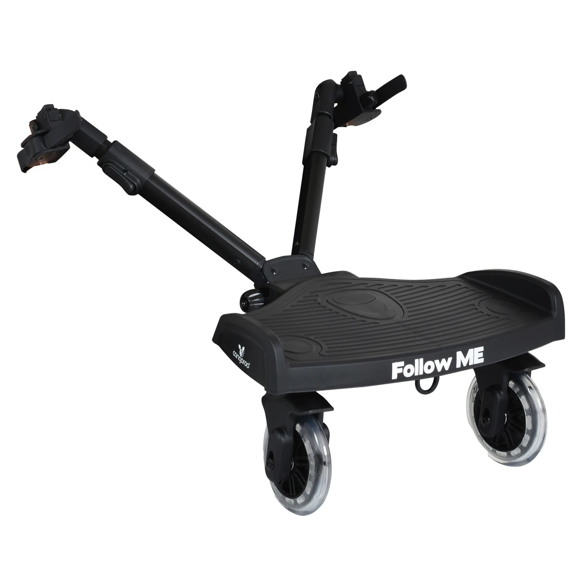 Dit meerijdplankje is universeel. Door de verstelbare bandjes waarmee je hem bevestigd, kan deze aan bijna elke kinderwagen bevestigd worden. Door de zwenkwieltjes blijft je wagen ook makkelijk te bewegen.