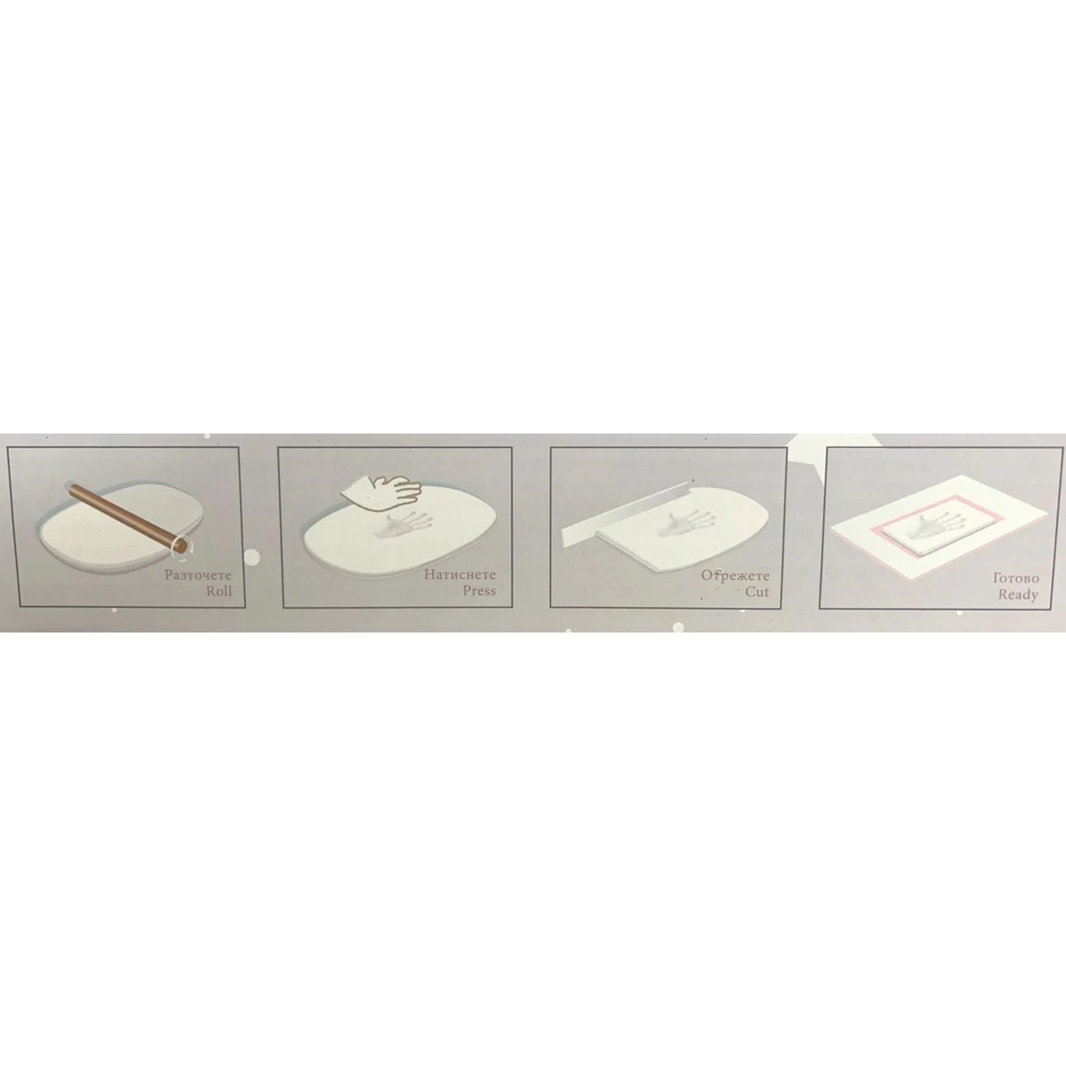 De set bestaat uit 2 klei afdrukken, voor een hand en een voetje. Met de roller zorg je dat het klei een glad oppervlakte wordt, daarna kan je kleine zijn handje/voetje er op leggen. Snij de afdruk uit in het gewenste formaat en de afdruk is klaar om in het fotolijstje te doen. Met de meegeleverde haakjes is het zelfs mogelijk om de lijst aan de muur te hangen.