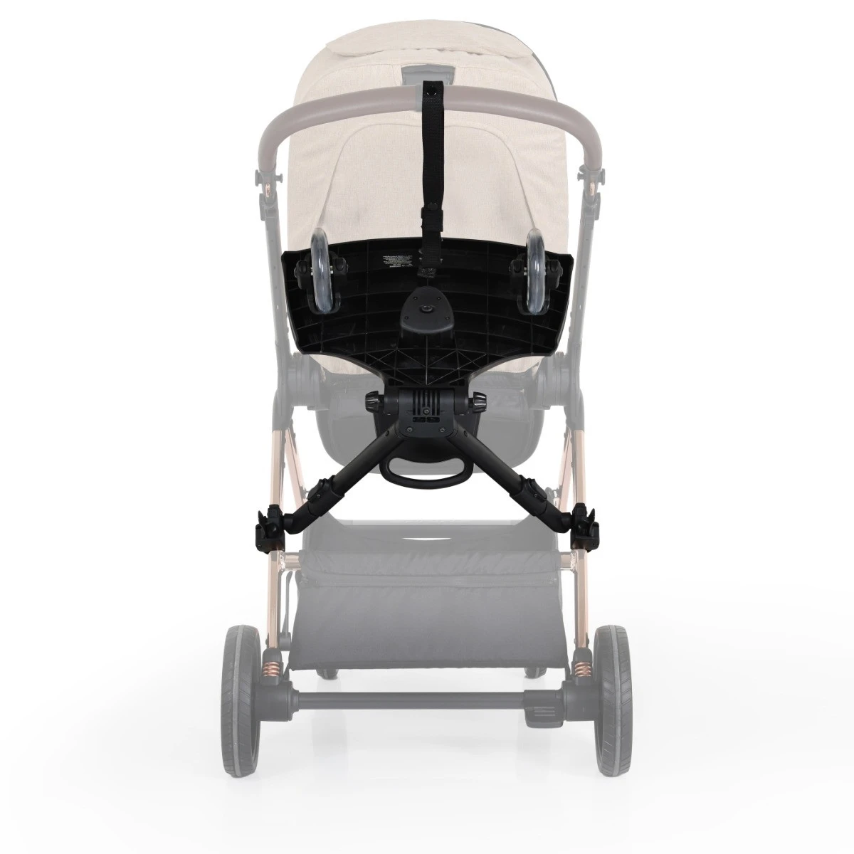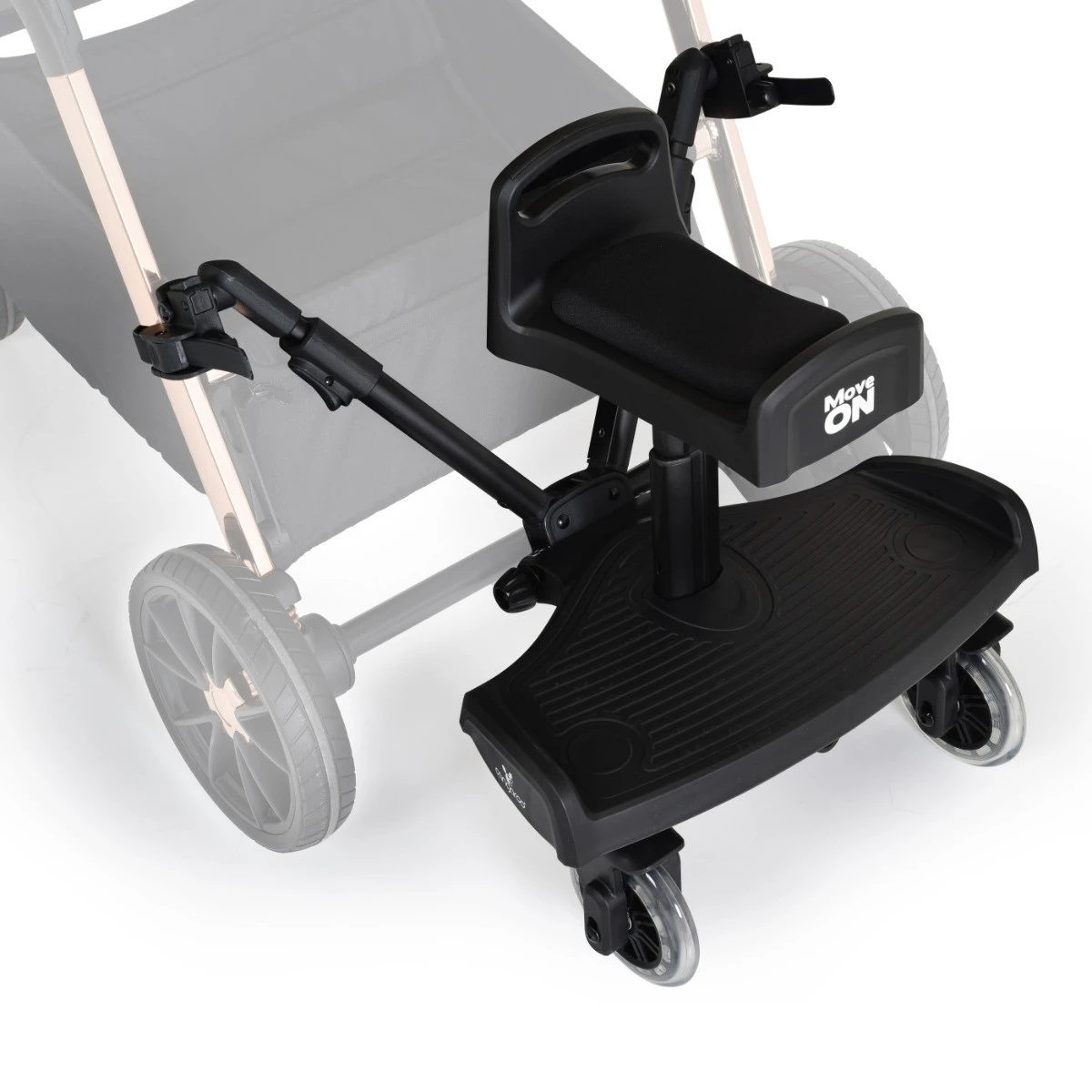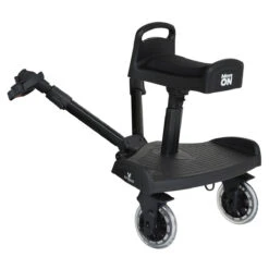 Dit meerijdplankje is universeel. Door de verstelbare bandjes waarmee je hem bevestigd, kan deze aan bijna elke kinderwagen bevestigd worden. Door de zwenkwieltjes blijft je wagen ook makkelijk te bewegen. Bij dit plankje wordt een zitje geleverd welke 90 graden draaibaar en verstelbaar is in 3 hoogtes. Zo kan je kindje altijd lekker zitten.
