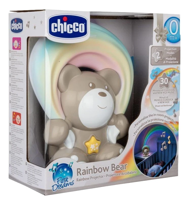De Rainbow Bear Babyprojector van Chicco zorgt ervoor dat je kleintje heerlijk wegdroomt in zijn of haar kamertje. Het schattige beertje projecteert een prachtige regenboog op de muur en het plafond. Niet alleen met een mooie projectie, maar ook met rustgevende melodietjes zorgt Rainbow Bear ervoor dat je kleintje heerlijk in slaap valt.