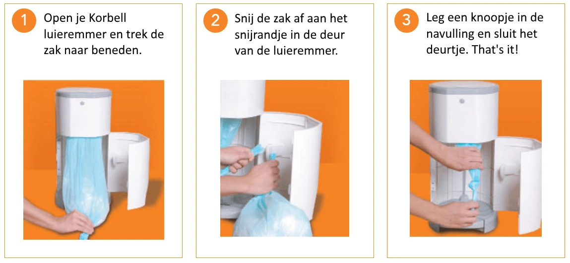 Het Korbell Nappy Disposal System is de eerste luieremmer waarbij je écht handig de luier kunt weggooien (niet draaien, doordrukken of induwen). Daarnaast is de luieremmer geurvrij zodat nare luchtjes verleden tijd zijn. De Korbell luieremmer werkt als een normale pedaalemmer; makkelijk te openen dus! Dankzij het afsnij-systeem is de Korbell luieremmer erg efficiënt in het gebruik van navullingen.