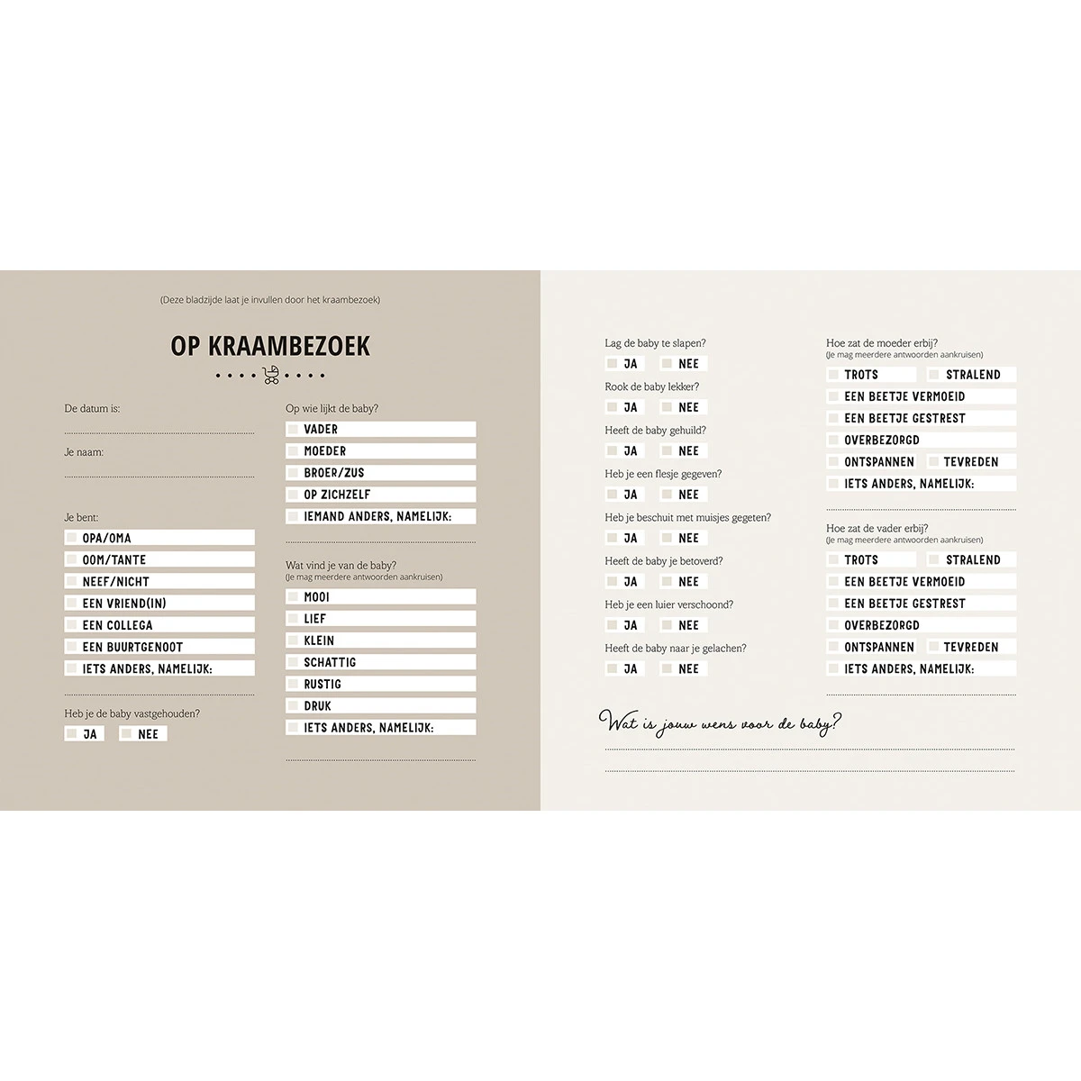 Dit mooie boek is van kwalitatief dik papier. De in totaal 96 pagina’s zijn mooi opgemaakt in pastelkleuren en de kaft is van stevig linnen met mooie gouden letters. Het boek heeft plek voor 15 mensen die op kraambezoek zijn geweest en bevat daarnaast verschillende invulpagina’s voor de ouders over onderwerpen als ‘wie ben ik’, ‘hoe werd ik geboren’ en ‘grote broer/zus’. Uiteraard is er ook volop plek voor dierbare foto’s!