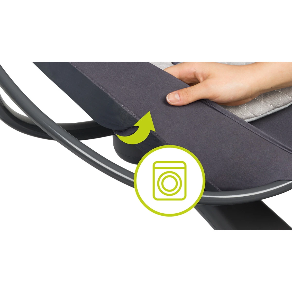 Het stoeltje heeft zachte bekleding en heeft een 5-punts veiligheidsgordel. Is de bekleding vies geworden? Dan haal je hem eenvoudig eraf om te wassen. Door de mesh-stof blijft de schommel lekker fris. Hij is te gebruiken met de USB-adapter (meegeleverd) of op batterijen (niet meegeleverd). Daarnaast bedien je de schommel eenvoudig met de toetsen op de base of met de meegeleverde afstandsbediening.