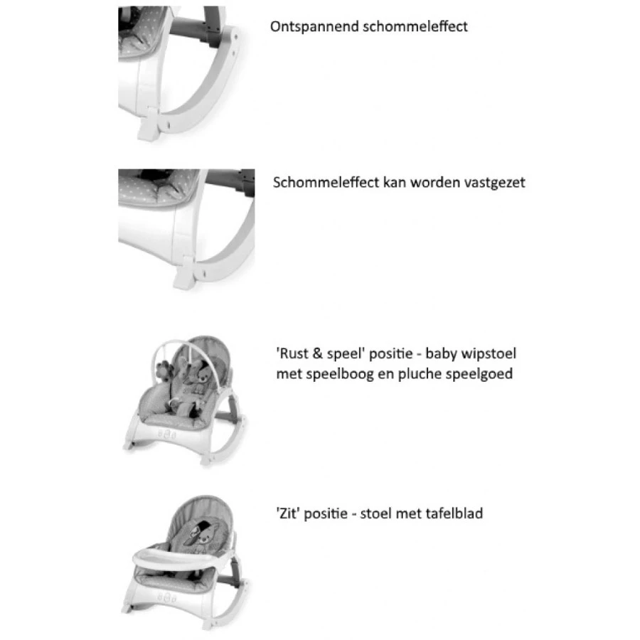 De Lorelli Alex is voorzien van een handig, afneembaar tafeltje dat je kunt verwisselen met de bijgeleverde speelboog. Aan de speelboog hangt een vlinder en een bloem waar je kindje naar kan kijken en grijpen, zodat je kleintje ook lekker kan spelen in de wipstoel! De Lorelli Alex kan ook worden omgebouwd tot stoeltje, waardoor deze te gebruiken is voor kindjes tot 3 jaar.