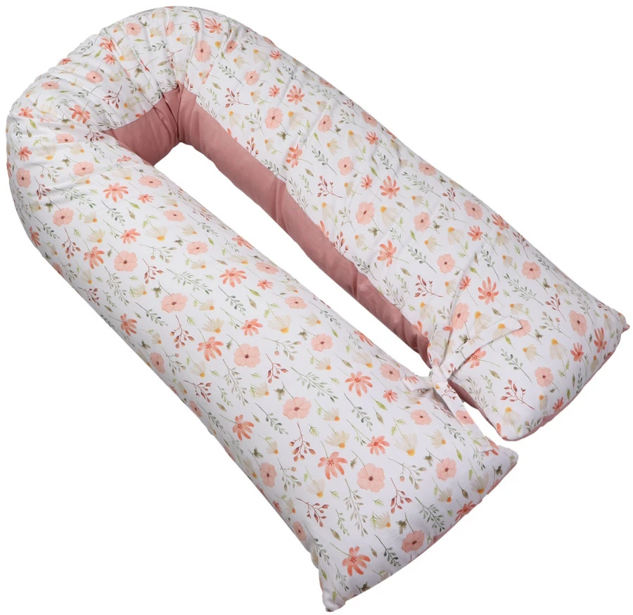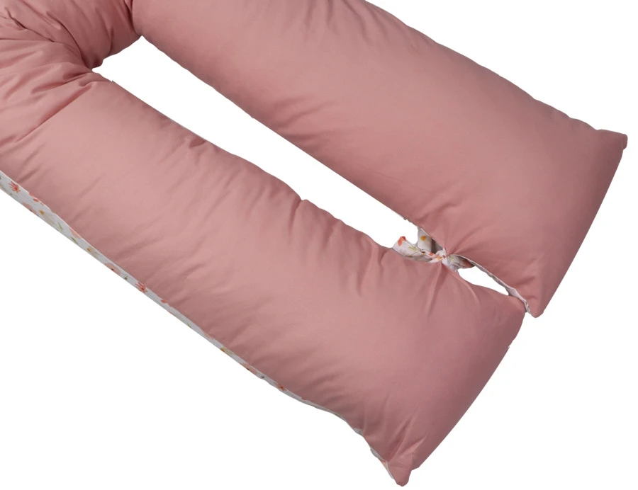 Het voedingskussen heeft een mooie print en een uni-kleurige kant: hierdoor kun je zelf kiezen welke kant je boven legt. Daarbij is hij voorzien van een afritsbare hoes die met de hand gewassen kan worden. Om de ronden vorm te behouden als je kleintje er op zit of tijdens het voeden, zitten er 2 touwtjes aan het einde van het voedingskussen die aan elkaar geknoopt kunnen worden. De lengte van het voedingskussen is 155 cm.