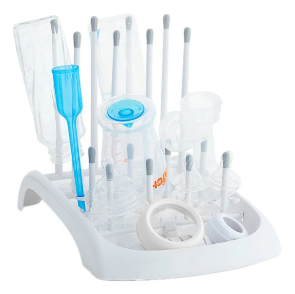 Een goed plekje vinden om alle flesjes te laten drogen is niet gemakkelijk. Met dit handige droogrek van Munchkin houd je het aanrecht vrij en kan je alles netjes en georganiseerd laten drogen. Het droogrek is ontworpen voor flessen, spenen, afsluitschijfjes, bekers, rietjes en kleppen. Dit droogrekje heeft afdruiptuiten in twee verschillende hoogten voor alle formaten flesjes en accessoires. Daarnaast hebben de afdruiptuiten zachte punten om krassen te voorkomen.