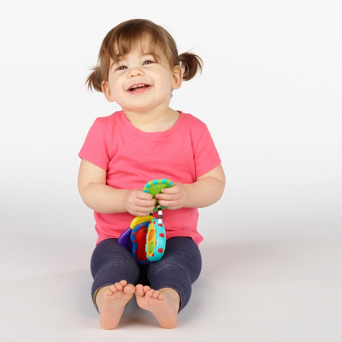 Wanneer je op de knopjes drukt hoor je verschillende geluidjes zoals autogeluiden en een claxongeluid. De felle kleuren dragen bij aan de visuele ontwikkeling en de verschillende texturen dragen bij aan de motorische ontwikkeling van je kleine. Het zachte gedeelte van de sleutels helpt bij het doorkomen van de tandjes van je kindje.