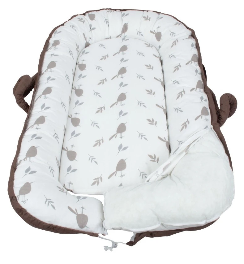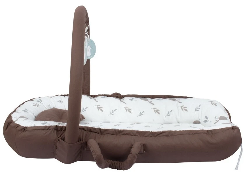 Het nestje heeft een ergonomische vorm en een extra hoofdkussentje. Je kleine zal zich niet snel vervelen, hij is namelijk voorzien van een speelboog met drie schattige kaartjes. Uiteraard is het ook mogelijk om andere speelgoedjes (niet inbegrepen) te bevestigen aan de speelboog. Tevens heeft hij een ruim muskietennet, dat je kindje beschermt tegen insecten. De hoes is gemaakt van 100% katoen en is afneembaar zodat je hem kunt wassen.