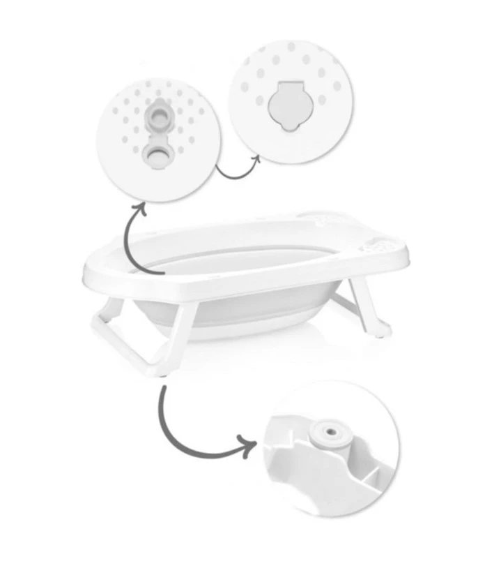 Doordat dit badje opvouwbaar is neemt het niet veel ruimte in beslag, ingeklapt is hij maar 10 cm hoog! Zo kun je hem gemakkelijk opbergen of neem je hem makkelijk met je mee. Ook het uitvouwen en opvouwen gaat erg soepel en na het badderen laat je het badje makkelijk leeglopen door de stop te openen. Daarnaast heeft het badje ook handige vakjes voor verzorgingsproducten.