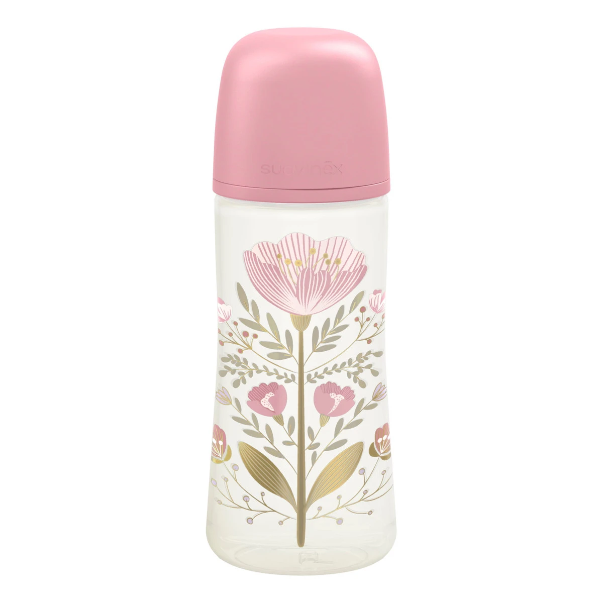 De fles heeft een inhoud van 360 ml en een siliconen speen. De Large Flow speen heeft een snelle uitstroomsnelheid waarbij er door het gat wat meer voefing komt. Hij is geschikt voor kindjes vanaf 6 maanden en het stijlvolle bloemen design maakt het helemaal af!