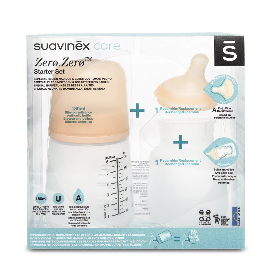 Met de Suavinex Zero.Zero starterset heb je alles wat je nodig hebt wat betreft voeding in de eerste maanden van je kleintje! De set bestaat uit 1 fles van 180 ml, een anti-koliek zakje en een speentje.