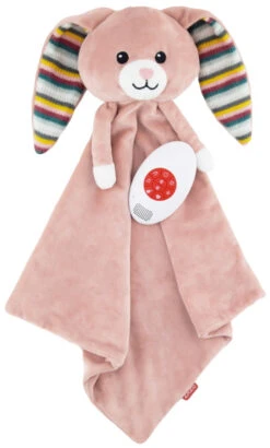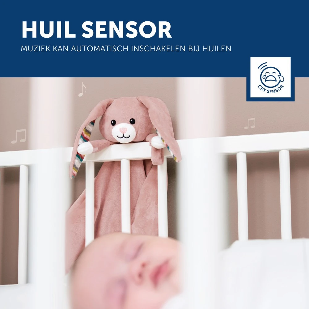 Becky speelt 6 verschillende geluiden af met de keuze uit een hartslag, natuurgeluid, white noise en 3 fijne slaapmelodietjes. Na 10 minuten schakelt de muziek automatisch uit. Als je kleine huilt, zorgt de huilsensor ervoor dat het laatst gekozen nummer weer wordt afgespeeld. Het knuffeldoekje komt met een module waarmee je de geluiden kunt kiezen en het geluidsvolume kunt regelen. De module kun je na het gekozen geluid in het hoofdje van het doekje plaatsen.