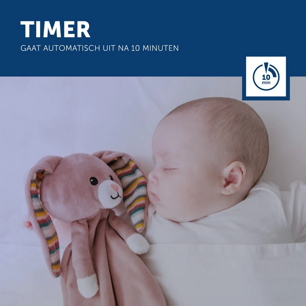 - 6 verschillende geluiden: hartslag, natuurgeluiden, white noise en 3 slaapliedjes