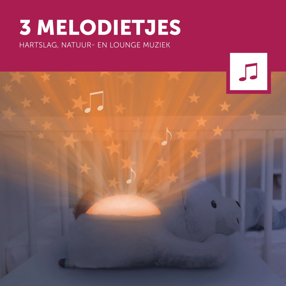 Niet alleen met mooie projecties, maar ook met rustgevende melodietjes zorgt Polly de ijsbeer ervoor dat je kleintje snel in dromenland belandt. Je kunt kiezen uit een rustgevend hartslag geluid, natuur of lounge muziek.
